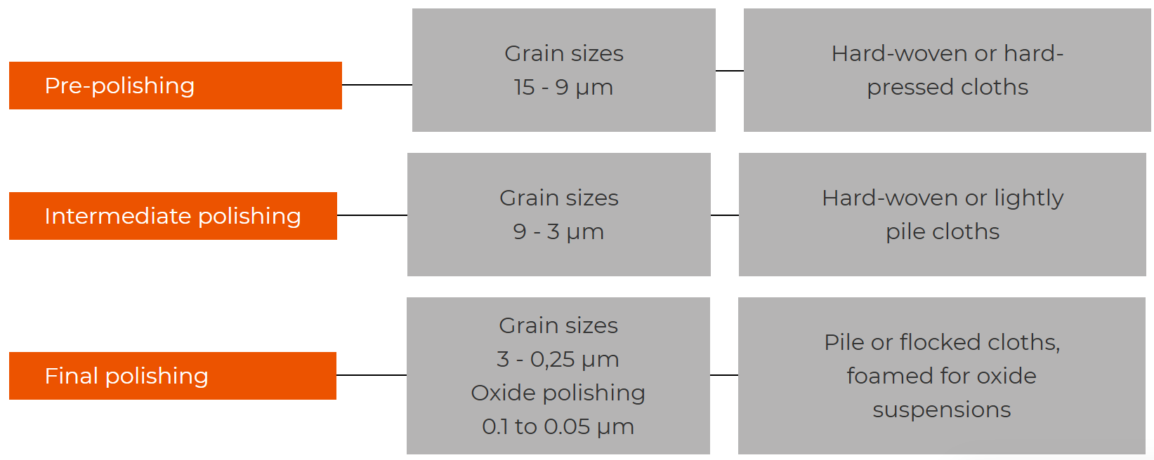 Das Polieren der materialographischen Probe dient dazu, ähnlich dem Schleifen und im Nachgang dazu, die in das Material eingebrachte Verformung zu beseitigen. Hierfür wird das ungebundene Abrasiv/Korn in schrittweise feiner werdender Korngröße auf spezielle Poliertücher aufgebracht. Dabei wird zwischen drei Poliervorgängen mit unterschiedlichen Poliermedien unterschieden: